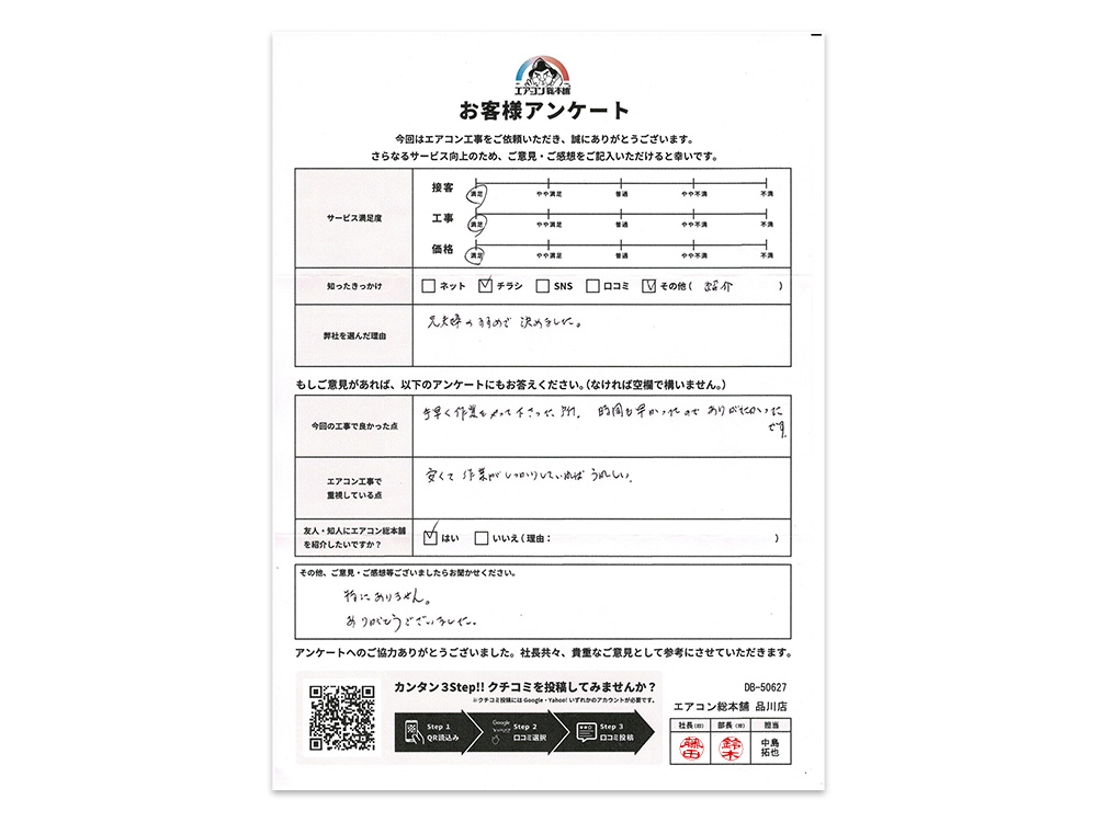 当初は、お送りいただいた写真でのお見積もりをご希望でしたが、既設機が現在リリースのない東芝製の天井埋込エアコンだったため、念のため実際に設置個所を見せていただきお見積もりいたしました。