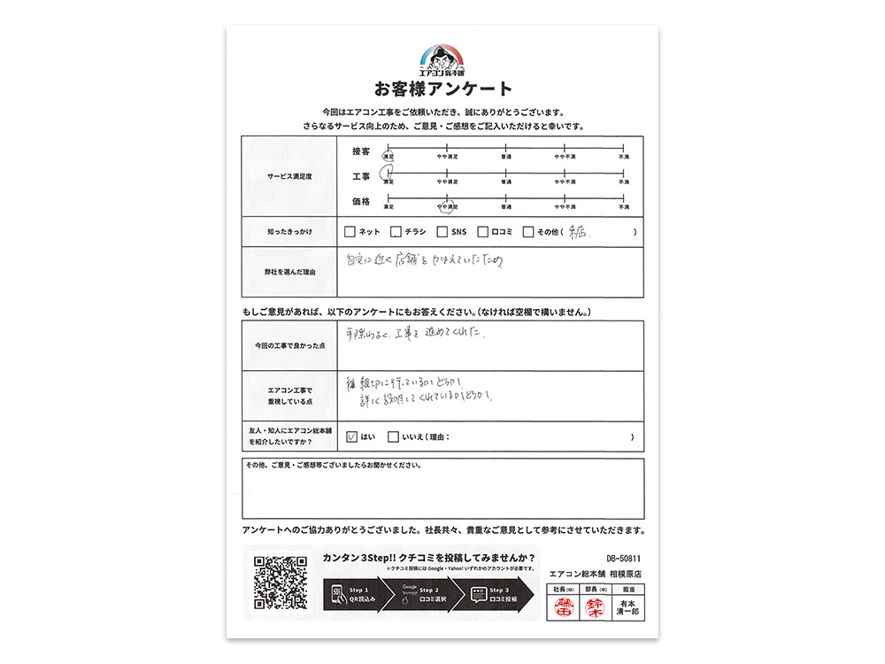 ご近所のお客様で、ご来店のあとすぐに現地調査とお見積もりをさせていただき、ご依頼いただきました。