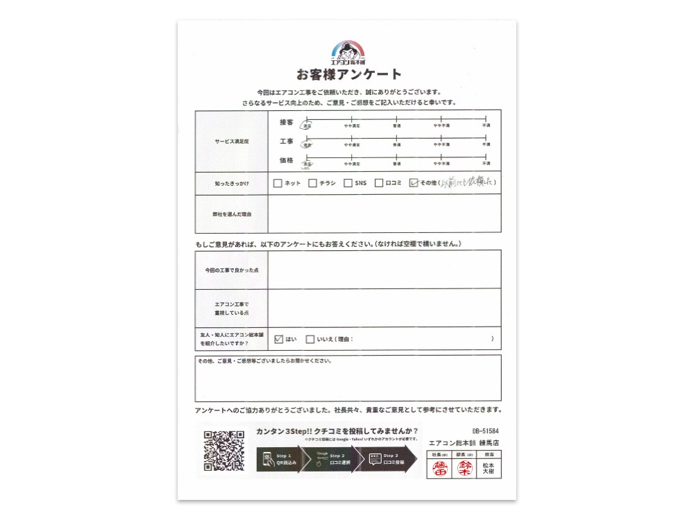 以前ご家族宅のエアコン設置のご依頼をいただいたお客様より、今回はご自宅のエアコン更新のご依頼をいただきました。
