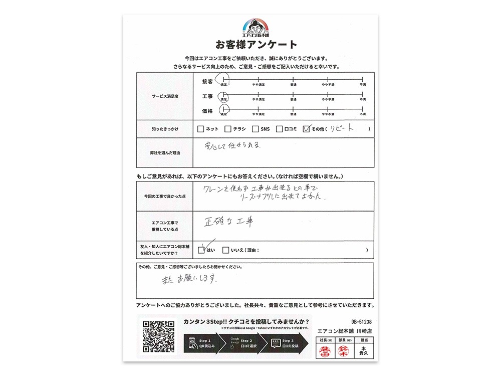 他社で見積もりを取った際に、室外機の搬出入にクレーンが必要で工事費が高額になるとのとのことでご相談いただき、弊社では簡易的な足場を作成して人力での搬出入をすることで、価格を抑えたご提案をさせていただきました。