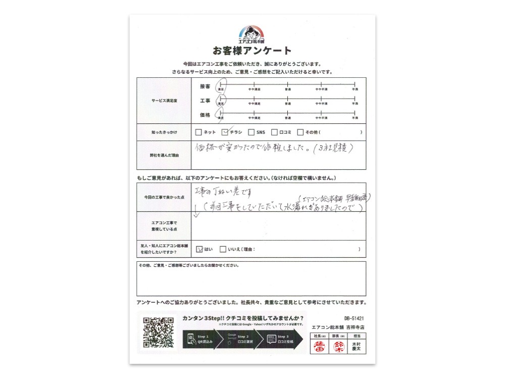 (前回工事をしていただいて水漏れがありましたので。エアコン総本舗早稲田店。)