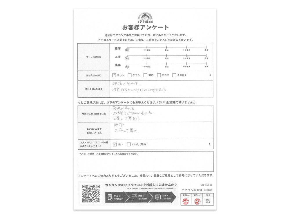 現状の電源で稼働できる単相機での提案を行い、容量の大きなものではなく、あえて容量の小さな室内機を複数設置する提案に切り替えました。