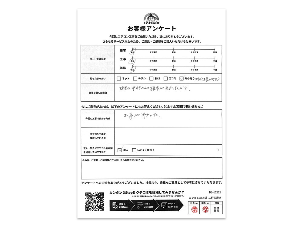 また、はじめは2Fに設置の1台のみのご依頼でしたが、そちらの対応にご満足いただき、後日1Fに設置分の更新もご依頼いただきました。