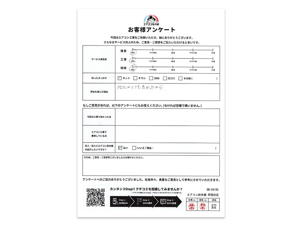 弊社を選んで頂いた理由 | 対応がとても良かったから。 |