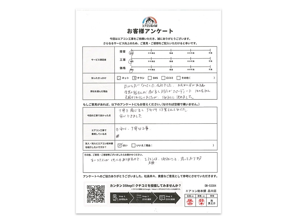 以前から弊社をご存じだったそうで、エアコン更新を検討のタイミングで折込チラシご覧になり、お問い合わせいただきました。